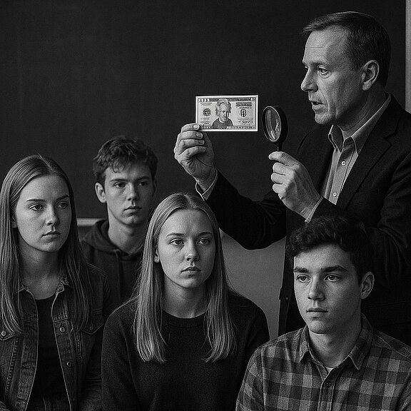 (Bildquelle: OpenAI. (2025). Schülerinnen und Schüler einer 10. Klasse bei einer Falschgeldschulung [KI-generiertes Bild]. ChatGPT, DALL·E.)