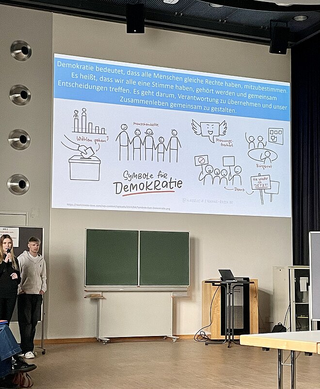 Danach wurden die verschiedenen Workshops präsentiert. Zur Auswahl standen unter anderem: „Wie Gesetze entstehen“, „Vielfalt“, „Ich, du, wir – Demokratie erleben“, „Fake News erkennen“ sowie „Demokratie-Entdecker“. Wir durften uns zwei Workshops aussuchen, mit Ausnahme des letzten, der ganztägig stattfand. Zwei von uns entschieden sich für den dritten und vierten Workshop, während die anderen beiden am ganztägigen Workshop teilnahmen.